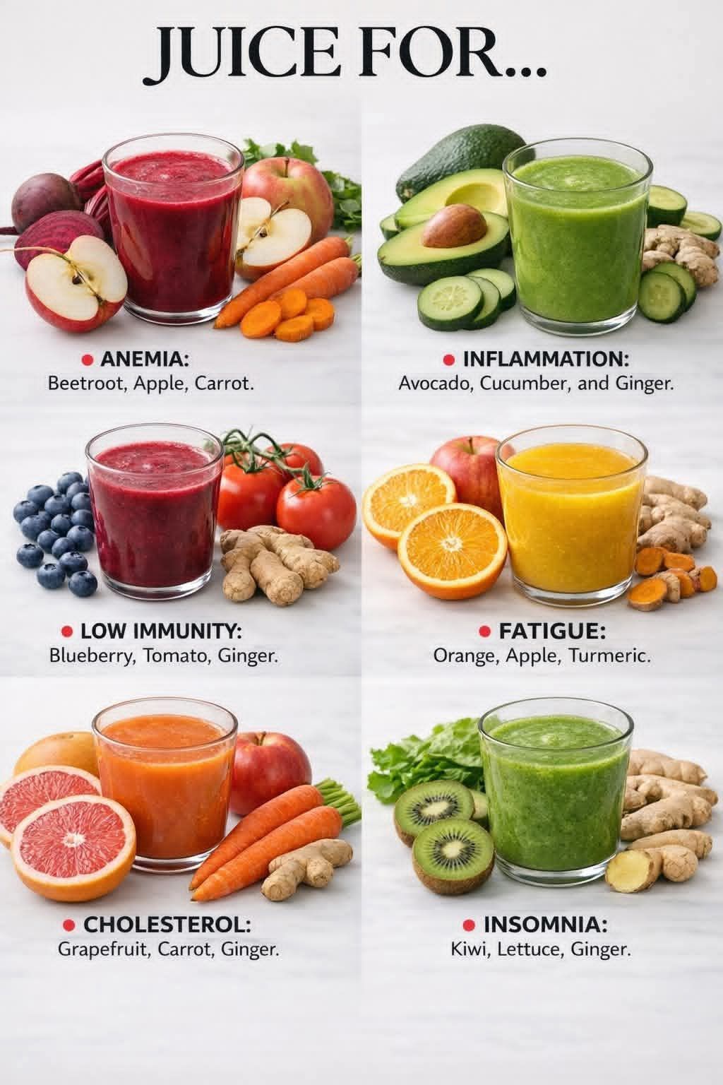 Concern Best Juice Blend Key Benefit Best Time to DrinkLow energy / fatigue Orange + Apple + Turmeric Steady natural energy MorningInflammation / puffiness Avocado + Cucumber + Ginger Cooling & soothing Morning or middayPoor circulation Beetroot + Apple + Carrot Supports healthy blood flow MorningLow immunity Blueberry + Tomato Vitamin C + antioxidants MorningHigh cholesterol support Grapefruit + Carrot + Ginger Lipid balance support MorningTrouble sleeping Kiwi + Lettuce + Ginger Calming compounds EveningDaily overall balance Spinach + Celery + Cucumber + Lemon Hydration + chlorophyll MorningActionable Steps to Start TodayPick just ONE blend that matches your biggest concern right now.