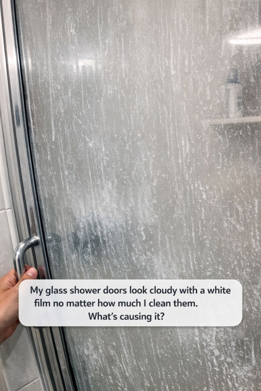 My glass shower doors look cloudy with a white film no matter how much I clean them. What’s causing it?