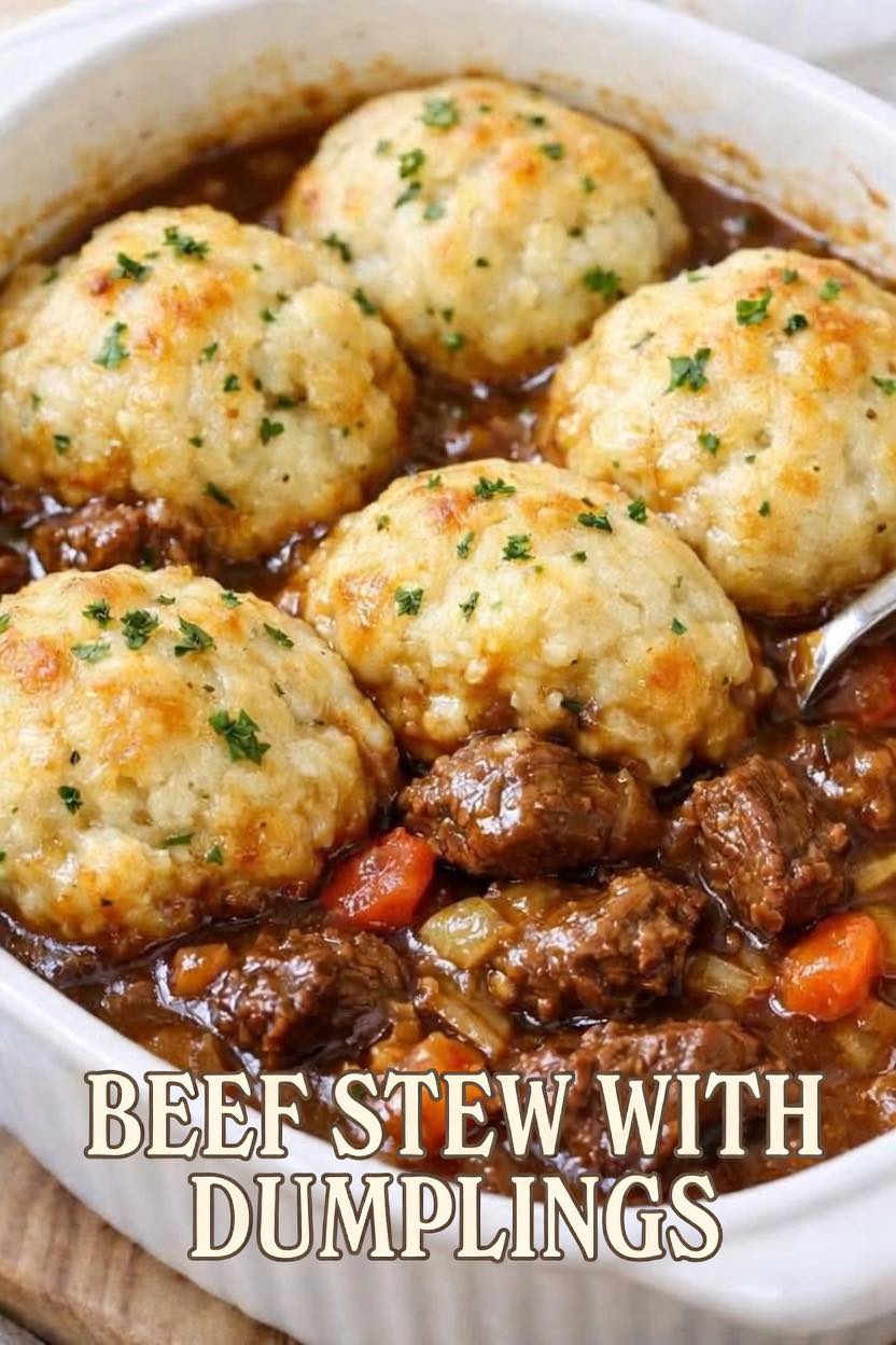 Beef stew with dumplings is the ultimate comfort dish—rich, hearty, and deeply satisfying. Tender chunks of beef simmer slowly in a flavorful broth alongside vegetables, topped with soft, fluffy dumplings that soak up all the delicious goodness.