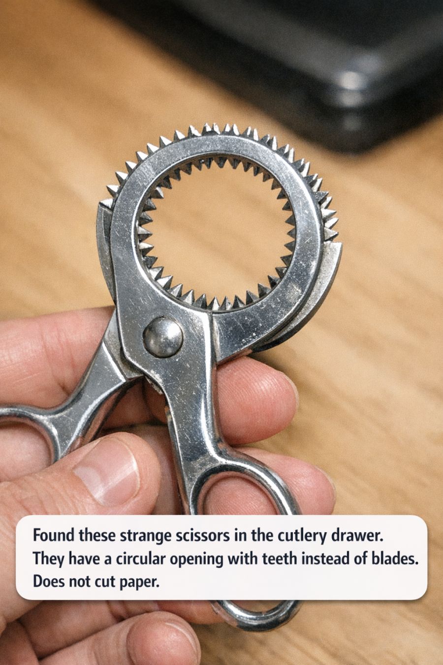 The reason these ‘scissors’ don’t cut paper lies in their unique design. Unlike conventional scissors, which have two sharp blades that slice through materials when brought together, this tool features a circular opening with small, tooth-like serrations. These serrations are not meant to shear or slice but rather to grip and crack.
