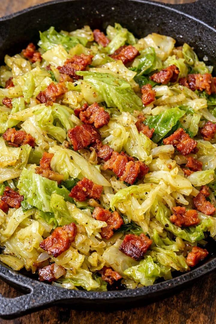 Serve this fried cabbage right out of the cast iron skillet alongside meatloaf, roast chicken, baked pork chops, or a simple pan-fried sausage. It’s especially good with cornbread or warm dinner rolls to mop up the bacon-y juices. For a fuller plate, add mashed potatoes or buttered egg noodles and a simple green salad. It also works beautifully as a cozy brunch side next to scrambled eggs and toast.