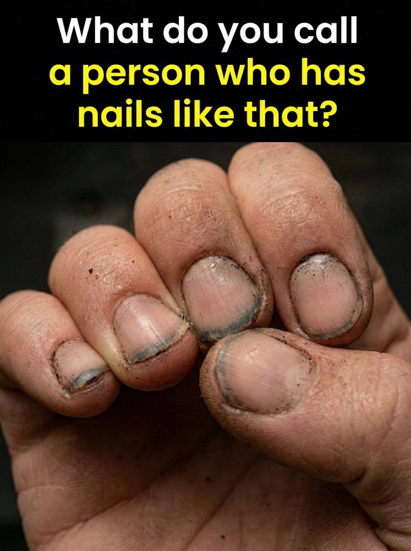 The image shows a hand with fingernails darkened by dirt, edges packed with grime. The immediate question that often follows is simple — and revealing:
